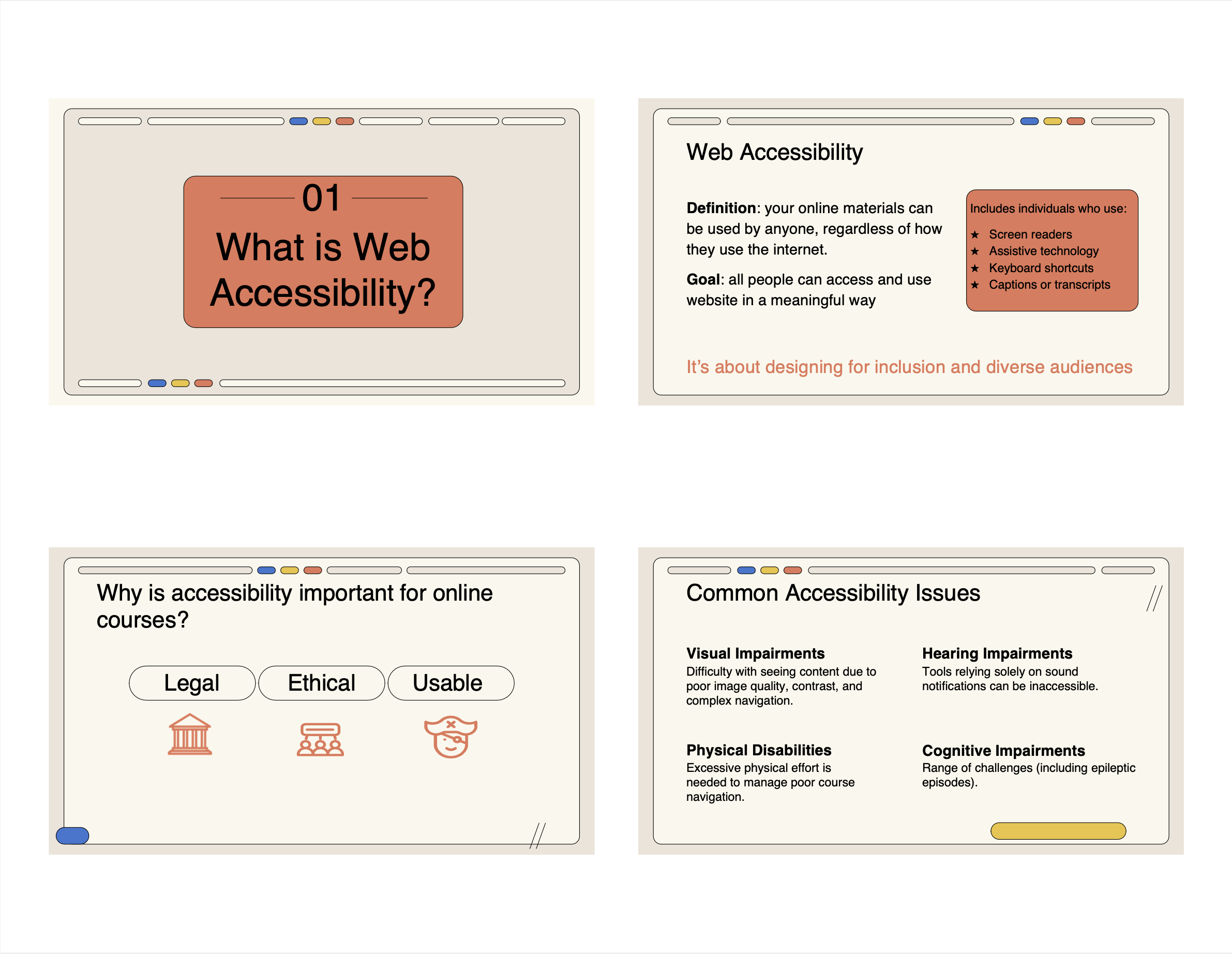 This session supported faculty in adopting web-accessible practices in digital course design, combining rationale, demonstration, and hands-on application.